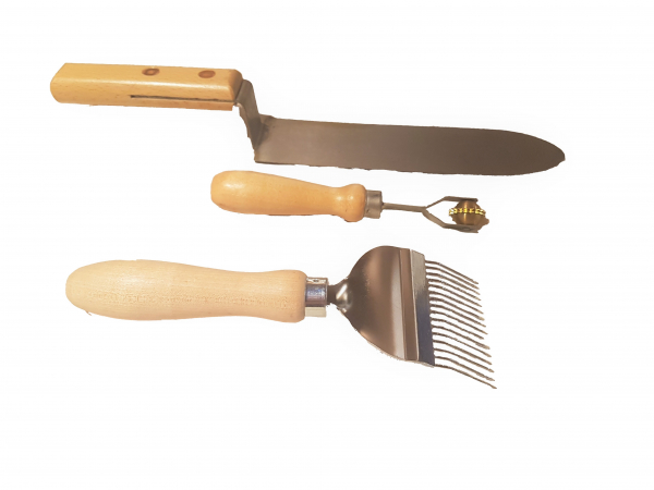 Med dessa tre redskap får du allt du behöver för att enkelt och effektivt avtäcka honungskakor inför slungning. Kniven används för att skära bort vaxlocken, gaffeln för att komma åt svåråtkomliga områden och kaksporren för att punktera celler där vaxet sitter extra hårt.