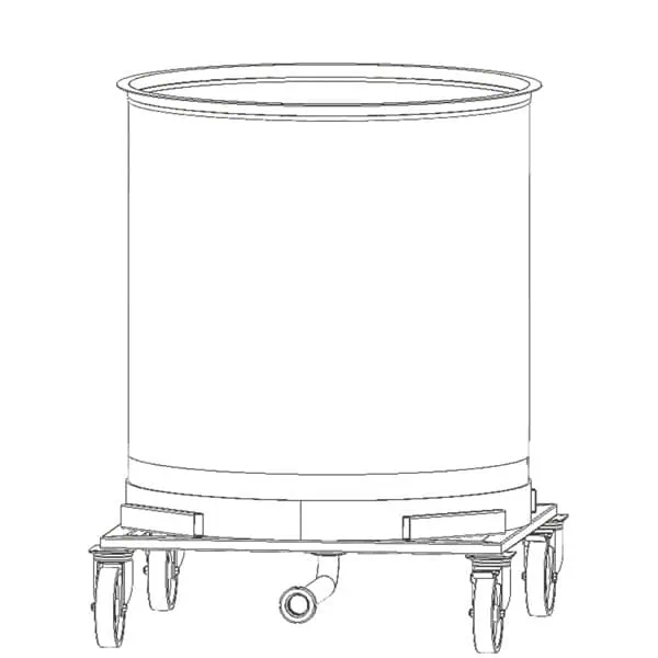 För enkel hantering levereras behållaren med ett stabilt rostfritt stativ på fyra hjul, varav två är utrustade med bromsar för extra säkerhet.