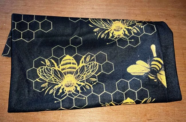 Mjuk och följsam buff i svart och gult med bin och bikakemönster. En mångsidig tubscarf som kan användas året runt och formas på flera sätt.
