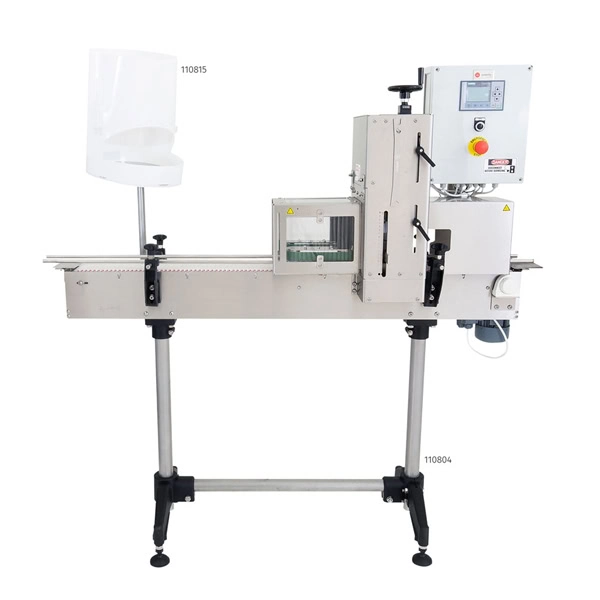 Burkar med löst placerade lock transporteras på bandet till skruvenheten där locket dras åt automatiskt. Enheten kan justeras för olika burk- och lockstorlekar, vilket ger stor flexibilitet i produktionen. Den elektriska driften bidrar till tyst och jämn gång, samtidigt som den ergonomiska konstruktionen minskar risken för sträcknings- och ligamentskador.