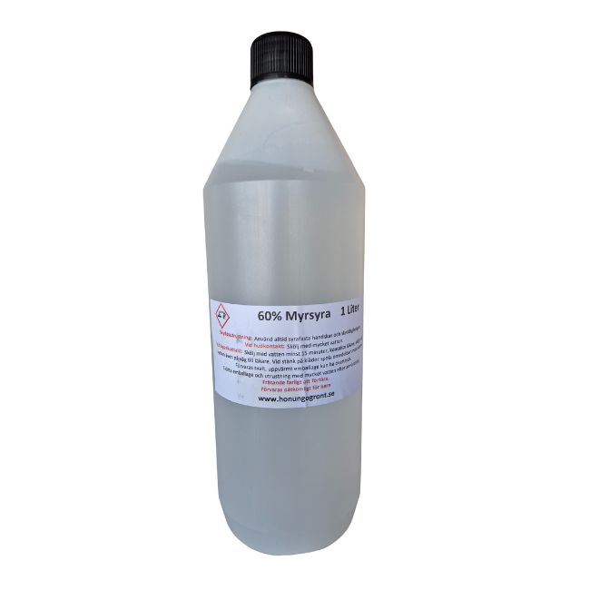 Myrsyra 60% eller 85% i 1 liters flaska – en välbeprövad behandling mot varroakvalster i bikupor. Används med försiktighet enligt anvisning.